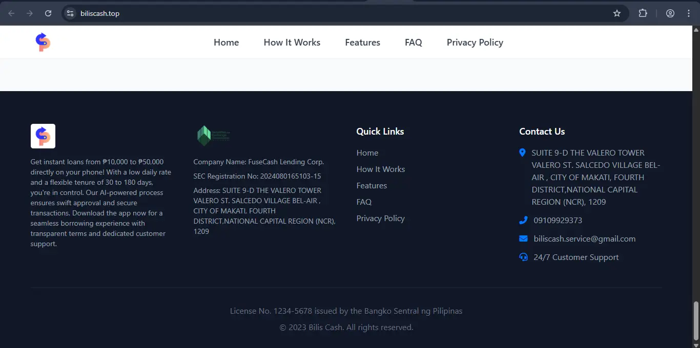 While the corporation is registered in Makati, our investigation into their domain (biliscash.top) reveals a different story that borrowers should be aware of.