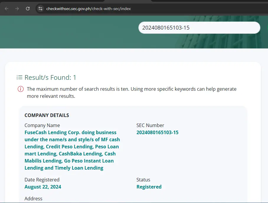 We have verified that FuseCash Lending Corp. does appear in SEC and AMLC registration lists. This means there is a legal entity behind the app.
