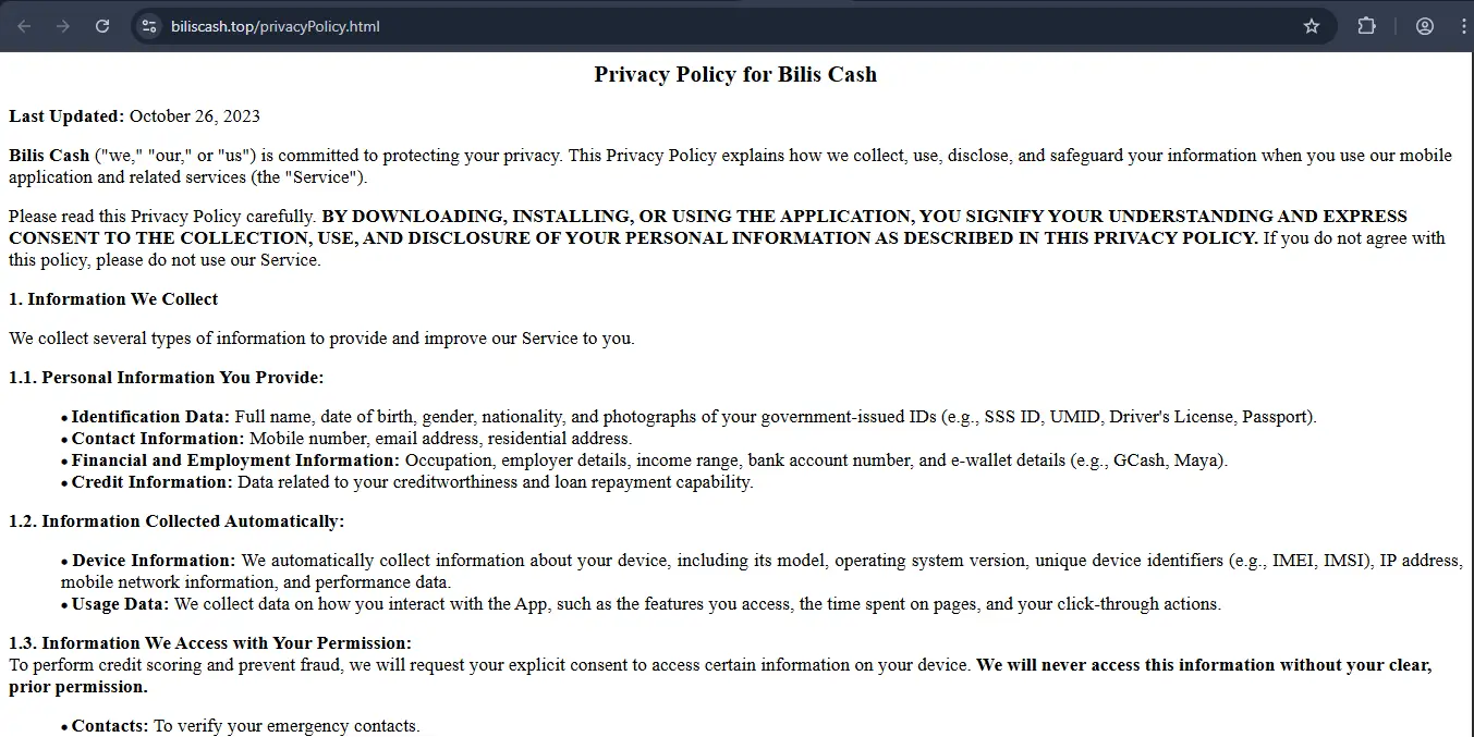 In the world of online lending, your data is the currency. We analyzed the Bilis Cash Privacy Policy (Updated Oct 26, 2023), and it requires significant permissions.
