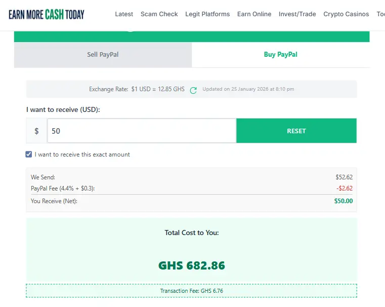 - The calculator will automatically adjust the GHS you need to pay us, ensuring that after PayPal takes their cut, you are left with exactly $50.00. No more falling short by a few cents!