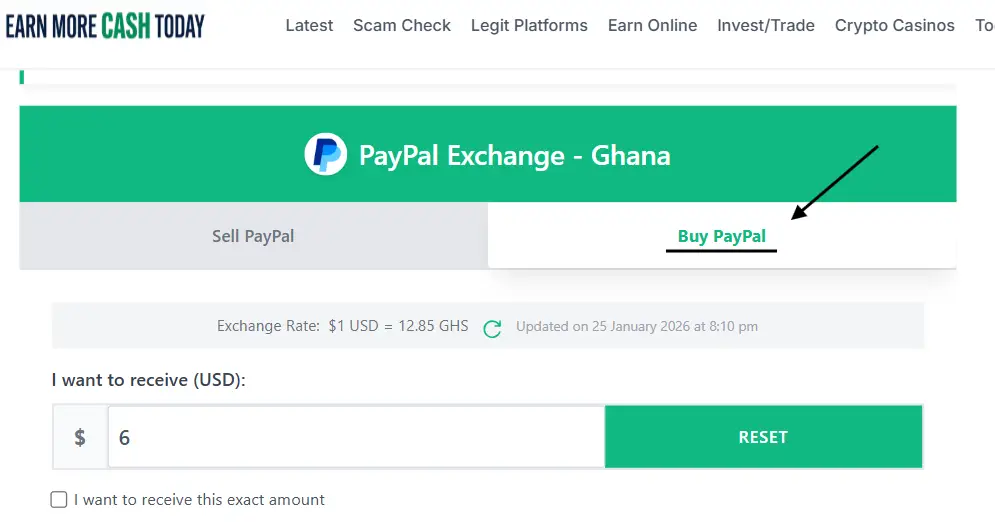 Visit the Earn More Cash Today PayPal Exchange tool and ensure the “Sell PayPal” tab is active.