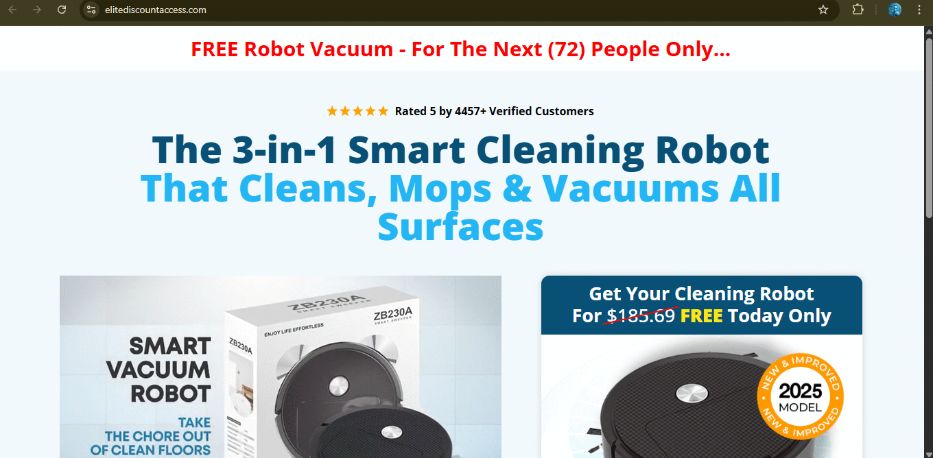 Online shoppers are constantly being targeted by fraudulent websites that make unbelievable promises to trick people into giving away money and personal details. One such site making rounds is Elitediscountaccess.com, which claims to offer a “FREE 3-in-1 Smart Cleaning Robot Vacuum” for the next 72 people. But is this really free or just another scam? Let’s break it down.