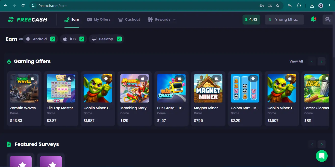 Freecash is a platform that pays you to complete online tasks. Advertisers pay Freecash to get users to try their apps, play their games, or answer market research questions. Freecash then splits that revenue with you.