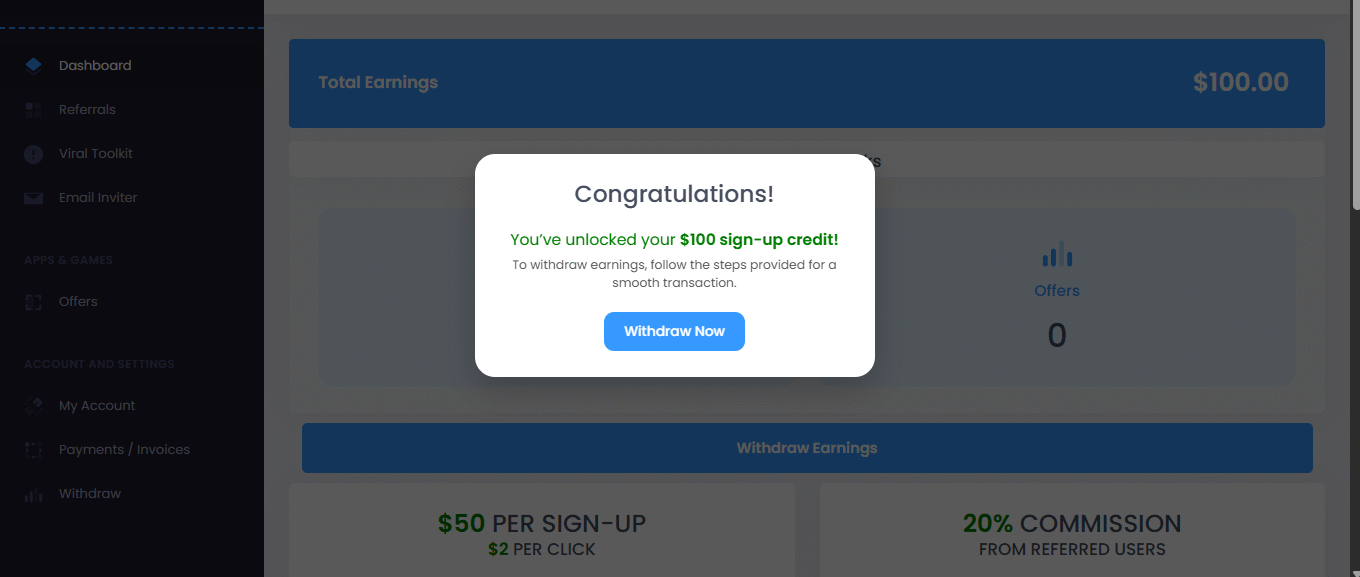 When you first sign up, you’re greeted with a flashy dashboard showing “Total Earnings: $100.00” and a pop-up congratulating you for unlocking a bonus. However, before you can withdraw, the platform demands that you complete certain requirements—like gaining multiple referrals or “unlocking” earnings.
