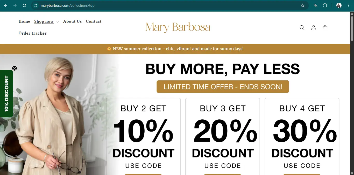 Marybarbosa.com is a fraudulent online store that lures customers with unrealistic discounts and fake promotions. While it looks like a bargain retailer, in reality, it delivers counterfeit products, low-quality items, or nothing at all. Worse, the site collects sensitive personal and financial information that may be misused for fraud or identity theft.