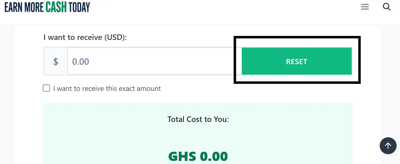 Inside the box where you type the amount, there is a “RESET” button. Clicking it instantly clears the amount and any calculated fees so you can start fresh.