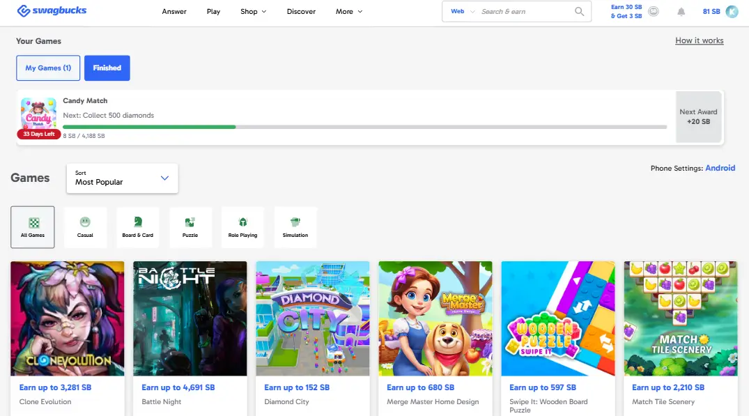 This is currently one of the highest-paying methods. Game developers pay Swagbucks to get new users to try their apps. You can earn anywhere from $10 to $100 (1,000 to 10,000 SB) for installing a game and reaching a specific level within a set time frame (usually 30 days).