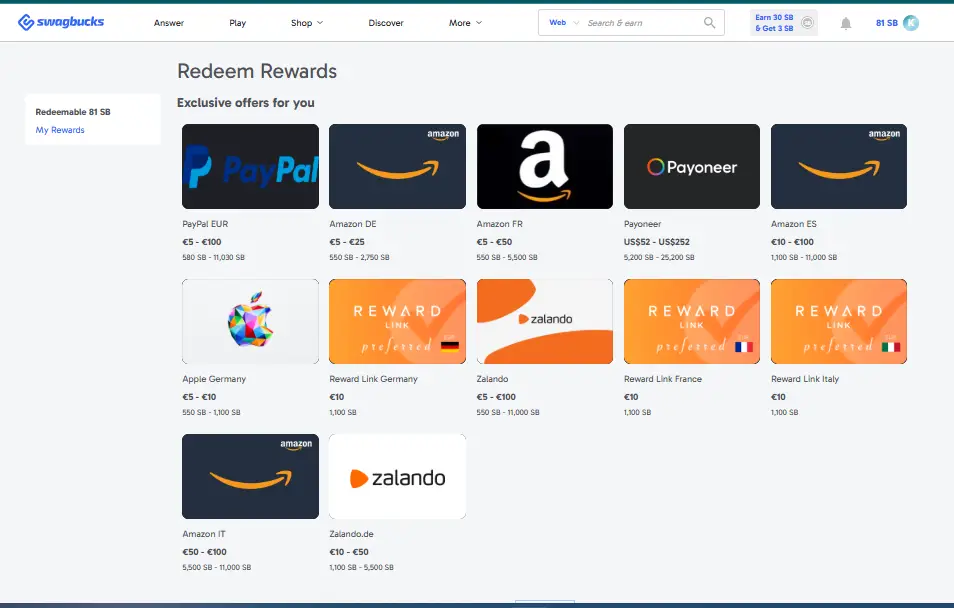 Pro Tip: Once a month, Swagbucks usually offers a discount on a $25 gift card. You might be able to get a $25 Amazon card for only 2,200 SB (a 12% discount).