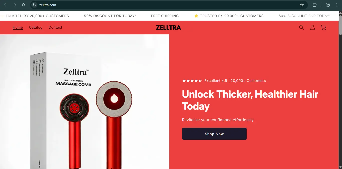 Zelltra.com displays professional design and persuasive marketing copy, but it lacks basic verifiable business details and buyer protections. Multiple design and content level red flags make this site risky to purchase from. Do not enter full payment details until the seller provides verifiable business registration, a company email, and secure third-party payment options.